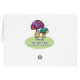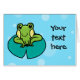 Um modelo customisable do cartão de cumprimentos que caracteriza uma ilustração digital adorável de um sapo verde de sorriso pequeno dos desenhos animados com os mordentes amarelos cobertos nos salpicos. Acalma em uma almofada de lírio do verde azul em um cheio da lagoa das bolhas