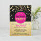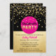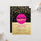 Jogando uma festa de solteira? Precisa de ideias? Obtenha estes modelos modernos e modernos personalizados para que você possa fazer ISSO facilmente. Rosa quente com confete dourado com fundo de folha preta e dourada. Barato, mas não de aparência barata. Personalize estes convites para a próxima festa. A parte traseira do cartão também tem texto para que você possa adicionar mais texto em caso de instruções especiais, como uma bachelorette de fim de semana!