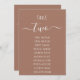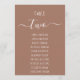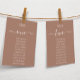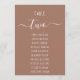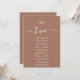 In the upper part, there is the table number written in a handwriting script and the word Table above, in smaller caps (hand letters). Under them, there are the 10 guest names, in similar hand letters. The background is a modern shade of brown, all text is white.