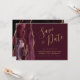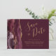 Este elegante e moderno salve o cartão de data apresenta uma borda de cor d'água borrifada, aparada com falso brilho dourado. O texto personalizável combina um guião de escrita manuscrita dourada, fontes em copperplate e itálico num fundo burgundy. O lado inverso apresenta uma burgundy e uma design de agata dourada.
