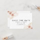 Os modernos pomares florais salvam o cartão de datilografia simples e minimalista no estilo do casamento floral, salvem o cartão de datilografia com dois arranjos de aquarela com rosas, pomares brancos e folhas de palma. O verso do cartão é organizado com uma mensagem e detalhes adicionais. Este design é ideal para um casal que procura uma simples e moderna data floral.