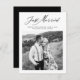 This modern minimalist black and white wedding elopement announcement features one front photo with elegant Just Married calligraphy script. Personalize the location and ceremony date details to let friends and family know where the private wedding took place. The back of this newlywed we tied the knot marriage announcement is sophisticated black, and the front is classic black and white. The photo will not automatically print in black and white, so if you would like to change a color photo to black and white please select that option during customization.