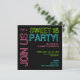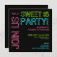 Este design gráfico me traz à mente uma velha placa de neon e faz uma declaração única e divertida sobre seus convites de festas Sweet 16. Em um verde limão brilhante, azul turquesa e rosa quente em um fundo preto - é divertido, jovem e moderno.