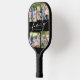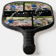 This personalized modern pickleball paddle features 4 custom photos, family name and year date, and the word “family” in elegant handwritten calligraphy script. The black background can be changed to your own custom color.