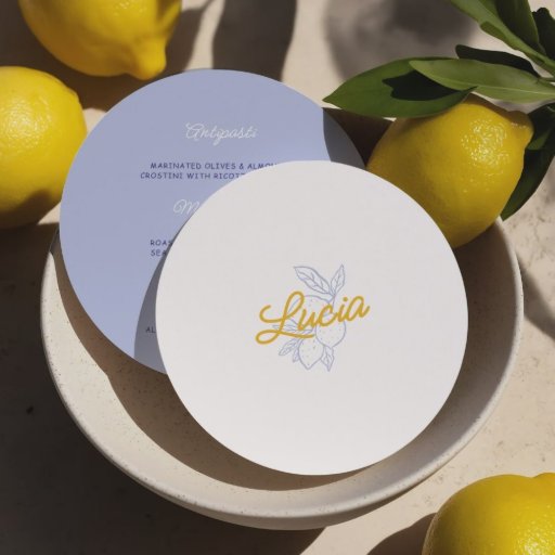 A fresh and elegant lemon wedding menu card featuring a soft blue palette with citrus-inspired details. The clean layout paired with handwritten script typography creates a light Mediterranean feel, perfect for summer weddings and destination celebrations.