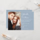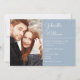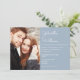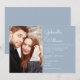 Moderno convite de casamento com letra elegante apresentando sua foto especial e detalhes da celebração em um fundo azul poeira. Criado por Thisisnotme©