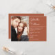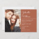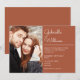 Moderno convite de casamento com letra elegante apresentando sua foto especial e detalhes da celebração em um fundo terracota. Criado por Thisisnotme©