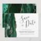 Este elegante e moderno salve o cartão de data apresenta um emerald verde aquarela agate border aparado com falso brilho dourado. O texto personalizável combina o script de escrita manual, as fontes em copperplate e itálico em cinzas de carvão em um fundo branco. O verso apresenta um design emerald verde e dourado.