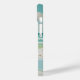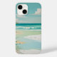 Uma pintura serena e cheia de luz de uma cena tranquila de praia. A composição é dividida em um céu macio com nuvens brancas e peludas, uma ampla extensão de um oceano azul-turquesa com ondas espinhosas e gentis, e uma costa arenosa. A praia é macia e branca, com sutis impressões de água fluindo pela areia. No primeiro plano, um aglomerado de plantas estilizadas verdes e azuis-claras adiciona um toque de detalhe natural. O fundo apresenta uma costa verde distante sob o céu limpo. O estilo é fluido e macio, com uma paleta harmoniosa de blues pastel, verdes e brancos, evocando uma atmosfera pacífica e sonhadora.