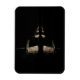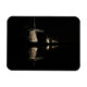 Imagem fotográfica retangular das famosas moinhos de Kinderdijk, ao longo do canal, com reflexo na água, iluminada na noite escura, criando uma cena surreal na Holanda.