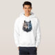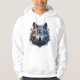 um capuz preto com um gráfico impressionante do rosto de um lobo na frente. O pelo detalhado do lobo é ilustrado em tons de cinza e branco, dando-lhe uma aparência semelhante à da vida. Os olhos do lobo têm um olhar intenso e focado, somando à vibração total e majestosa da design. O capuz em si parece confortável e casual, fazer adequado para o visto cotidiano, enquanto o gráfico do lobo lhe dá uma ousada, fazer de declaração.