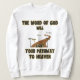 Esta design das mulheres tem uma impressão com letra condensada kapsalon com letras negras que mostra a frase "A Palavra de Deus iluminará seu caminho para o céu" com uma coleção de luz de rua ao longo do caminho mais um sinal que mostra a palavra Céu, aponte para baixo no caminho desse tema de bíblia baseado na fé. Esta camisola é feita de 100% de algodão, esta camisa é ao mesmo tempo peluda e durável, que faz uma combinação de excelentes com uma imagem correspondente menor impressa no verso.