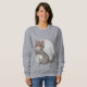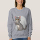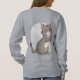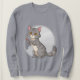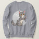 Um adorável gatinho cinza tabby fica em pé, segurando uma pequena flor com as patas. Alegre, brincalhão e convidativo, perfeito para família, cuidados com animais de estimação ou marca para crianças.