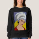 A camiseta numa moderna e semimontande, Art Deco, inspirou o retrato de uma senhora em vermelho com um turbante branco, contra uma cinza amarela e azul