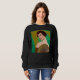 A camiseta numa moderna e semimontande, Art Deco, inspirou o retrato de uma moça humorística, segurando um fã, contra um fundo verde-jade e cor de ouro