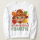 Celebrate the season of gratitude with this cozy autumn-themed sweatshirt featuring a cheerful scarecrow face, plaid hat, and vibrant fall leaves. The bold “AUTUMN BLESSINGS THANKFUL” message makes it perfect for Thanksgiving gatherings, fall festivals, or chilly November days. A warm and festive choice for anyone who loves autumn vibes.