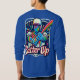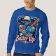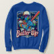 O design da t-shirt "Batter Up" apresenta uma cena dinâmica de baseball com uma ilustração arrojada e recheada de ação de um jogador a balançar um bastão. O jogador é capturado balançando médio, com linhas de energia enfatizando o movimento. Ao fundo, um diamante de beisebol sutilmente desaparece em vista, com as palavras "Batter Up" gravadas em negrito e com letra esportiva. O design é vibrante, com uma mistura de cores de equipe — como azul profundo e branco brilhante — criando um contraste poderoso. A camisa transmite o entusiasmo do jogo, perfeito para qualquer fã de beisebol.