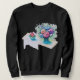 Flores vibrantes em tons de rosa, roxo, laranja e azul são representadas em estilo de desenho solto, com um grande buquê em um vaso azul e um pote menor em uma mesa claramente marcada. As braçadas são expressivas e coloridas, transmitindo um senso de vida e espontaneidade artística.