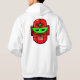 Uma cabeça de robô em vermelho com um painel de olhos em forma de crescente verde na moda, um terceiro olho verde, com dentes brancos e destaques. Ele tem um tipo estranho de sorvete como se tivesse descoberto as maravilhas de um novo e revolucionário óleo motor. De um desenho vetorial original de N.A. Berry. O motivo é repetido tanto na parte de trás como na frente.