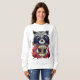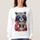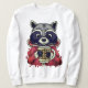 Um guaxinim bonito vestindo um capuz vermelho segura uma xícara de chocolate quente