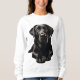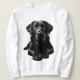 Imagem de um labrador preto sentado em uma camisa de suor.