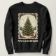 Uma árvore de Natal esbranquiçada emoldurada num selo de correio retrô faz com que esta feliz de camisola fique brilhante. Festivo, colorido e aconchegante, é a roupa de férias perfeita para decoração, doação, ou lounging fireside.
