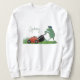 Um sapo verde engraçado cortando a grama no estilo de desenho animado do bobo.