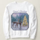 Um galo branco e um pombo estão numa clareira cercada por uma floresta de pinheiro e de abeto, seus galhos pesados com neve. No meio da clareira está uma árvore de Natal decorada com luzes quentes de férias brilhando pela neve para iluminar a noite escura de inverno. Trabalho de arte realista criada de uma pintura original de petróleo pelo artista da vida selvagem Crista S. Forest.