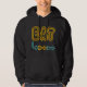 A arte retrô do EAT baseada num cartaz de restaurante neon vintage. As letras são amarelas e vermelhas, as setas são azuis, vermelhas e amarelas. Arte de publicidade divertida para pessoas que cozinham ou comem.