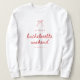 Coquette Bow Script Custom Bachelorette Weekend Sweatshirt. A modern and minimalistic bachelorette sweatshirt, designed with "bachelorette weekend" in script lettering. Personalize with bride's name, and weekend location below.