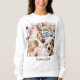 Crie o seu costume moderno de uma espécie de camisa de colagem de fotos ou dê-la como um aniversário, natal ou presente de dia de as mães às mulheres que você aprecia. Este design original apresenta uma grade de quatro fotos com uma imagem centrada em forma de coração de uma jovem família e cão que você tem que personalizar com suas próprias fotos. Ele exibe uma linha de texto personalizado na fonte de script manuscrito preto. Escreva sua própria mensagem personalizada, como sobrenome familiar, monograma, nome de animal de estimação, citação, desejo de aniversário, nota de amor, comemorativa, etc.