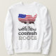 Mapa dos EUA com raízes, com bandeiras americanas e da Cornualha e o texto Cornish Roots por baixo.