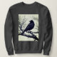 Sweatshirt in a black-and-white illustration featuring a sleek black crow perched on a gnarled, leafless branch. The bird's detailed feathers contrast sharply with the stark, skeletal tree limbs, creating a dramatic composition.
