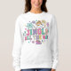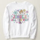 Celebrate the season with sparkle and joy! This cozy sweatshirt features a cheerful snowman in a knit hat, surrounded by colorful snowflakes, stars, and a sleigh full of presents. The bold “JINGLE ALL THE WAY” message adds a playful touch, making it perfect for family gatherings, holiday parties, or matching group outfits.