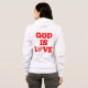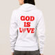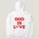 Este capuz de mulheres apresenta um pedaço de cinco impressão com letras vermelhas mostrando o ditado bíblico "Deus é amor" com o O in Love feito substituído por uma coleção da palavra Amor feito em um coração neste tema bíblico de citação. Este capuz é incrivelmente macio e relaxado, rodado de um excelente de mistura de poli-algodão embebido para visto diário com uma imagem correspondente maior impressa no verso.