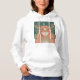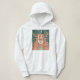 Uma mulher com cabelo longo e fluido em tons de rosa e laranja. Ela tem um rosto como uma máscara com detalhes intrincados e uma lua crescente enfeitando sua testa. O cabelo dela é enfeitado com traficantes e um quadro circular com símbolos e estrelas. Abaixo do seu rosto, uma criatura tipo dragão emerge do cabelo, sua cabeça virada para baixo. O fundo é uma cor verde sólida.