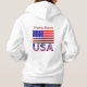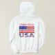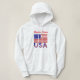 O capuz personalizado apresenta a bandeira dos Estados Unidos da América ou, com as letras EUA abaixo, no vermelho, branco e azul, com estrelas e listras, encontrado na bandeira. Personalize adicionando seu nome ou, para um presente criativo, adicione o nome de outra pessoa. Diversão para as comemorações do Dia da Independência e reuniões familiares.
