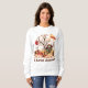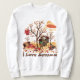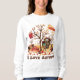 Cenário do outono e da queda com a casa velha e fantasma assombrados afligidos da fazenda ajustados contra Rolling Hills e árvores douradas do outono com sol ou lua amarela com nuvens e guarda-chuva alaranjado, miúdo no traje do Dia das Bruxas, tela assustador do cinema do filme de terror, pipoca, relógios do filme, abóboras da colheita, maçãs de doces, cogumelos, folhas da queda, futebol, camisola da queda e do inverno e acção de graças selvagem Turquia. O texto lê: Eu amo o outono