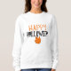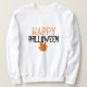 Camisola de Halloween A família moderna que combina com a camisa de Halloween design apresenta o texto "Happy Halloween" em letras laranja e brancas com um pequeno sotaque fantasma. Encomenda cada membro da sua tripulação.