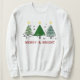 Árvores de Natal Verde feliz e Brilhante na frente em vários tons de verde. O esboço preto de cada um é um fazer único, este é um suéter moderno estilo escovado. Cada árvore tem uma estrela amarela brilhante no topo e é enfeitada com estrelas pretas ao redor de cada árvore. As palavras "Feliz e Brilho" no tipo colégio vermelho acrescentam ao design caprichoso desta camisola. Personalize o texto ou deixe como está.