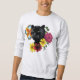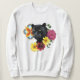Um retrato ao estilo da tatuagem em jaguar preto. Ao redor da face da onça estão flores mexicanas vibrantes e coloridas em vermelho, fuchsia e amarelos. Atrás do Jaguar está um azulejo tradicional mexicano num pano de fundo de uma brasa.