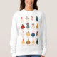 Um grupo de galinhas e galos coloridos, bonitos e engraçados, que ficam em filas.