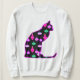 Camisola numa silhueta de gato sentado a preto, com um padrão de férias de ornamentos antigos de árvores de Natal em tons cor-de-rosa, verde e lavanda