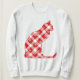Camisola numa silhueta sentada de gato, com um padrão de férias de xadrez de búfalo vermelha e branca e flocos de neve espalhados