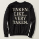 Stay cozy while showing off your groom status with a fun twist! This stylish sweatshirt features the bold and humorous phrase “Taken. Like… VERY Taken.” on the back — perfect for bachelor parties, wedding weekends, rehearsal festivities, or casual honeymoon wear.