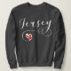 Sweatshirt com design com na moda com a bandeira de Jersey num coração. Jersey, oficialmente o Bailiado de Jersey é um país insular e uma Dependência Crown que se governa perto da costa do noroeste de França. É a maior das Ilhas Anglo-Normandas e está a 14 milhas (23 km) da Península de Cotentin, na Normandia. O Bailiado é constituído pela principal ilha de Jersey e por algumas ilhas e rochas que circundam, não habitadas, incluindo Les Dirouilles, Les Écréhous, Les Minquiers, e Les Pierres de Lecq.