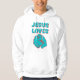 Este capuz tem uma mão azul com um dedo apontador e um contorno de sombra vermelha exibindo as palavras "Jesus ama" em uma impressão ousada com um contorno sombrio correspondente no tema da citação baseada na fé. Este capuz é feito a partir de uma mistura de algodão de 10 oz, capas de 100% de algodão embutidas na face de algodão e furos de agulha dupla coçados e banda inferior para durabilidade extra tem uma imagem correspondente no verso.