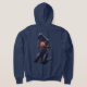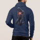 Unlock the void. This Dark Fantasy Sci-Fi hoodie fuses ancient Magic with forgotten Cyberpunk tech. Featuring a hooded figure kneeling with a fiery glowing orb (Back) & a mystical clockwork sigil (Front). Your essential Neo-Gothic gear for gamers & fantasy fans. Worn armor look on a dark blue zip-up.