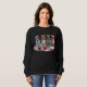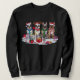 Camisola branca com quatro Bulldog Franceses com chapéus de Santa, chifres de renas, fantasias de elfo e luzes de Natal. Design adorável, perfeito para o feriado, especialmente o Natal, um grande feriado nos EUA. Você atrairá atenção e expressará seu amor por cachorros, criando um estilo único, quente e alegre.