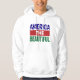 Design de tipografia patriótica com as palavras "América A Beleza" com texturas de estrela e mapa topográfico.